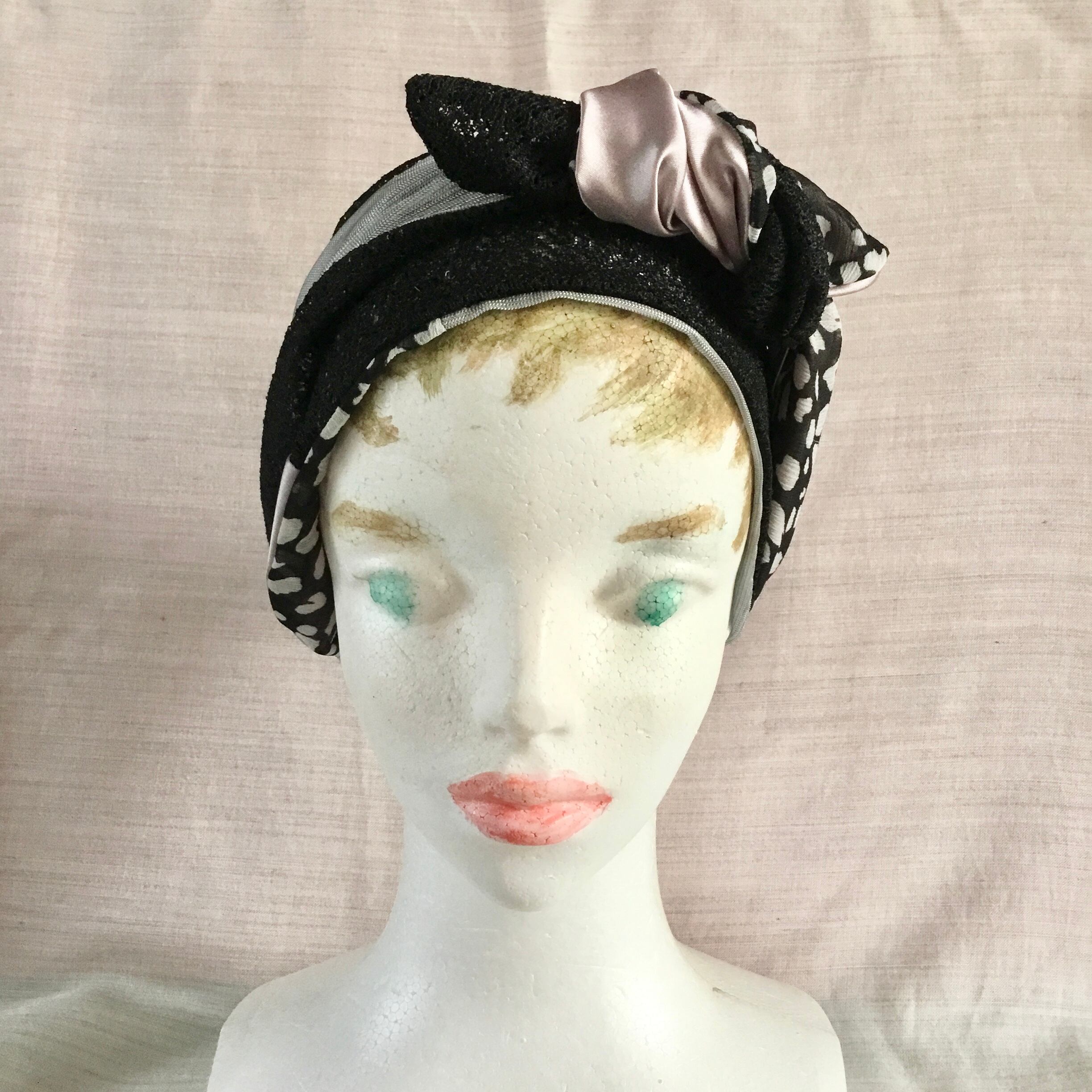 ・「隠れたハート」・・・柔らかな楊竜シフォン生地をポイントにしたターバン。こちらの柄にはハート形の模様がいくつか見え隠れしています。淡いピンクラベンダーの光沢生地で、華やかさを加えました。