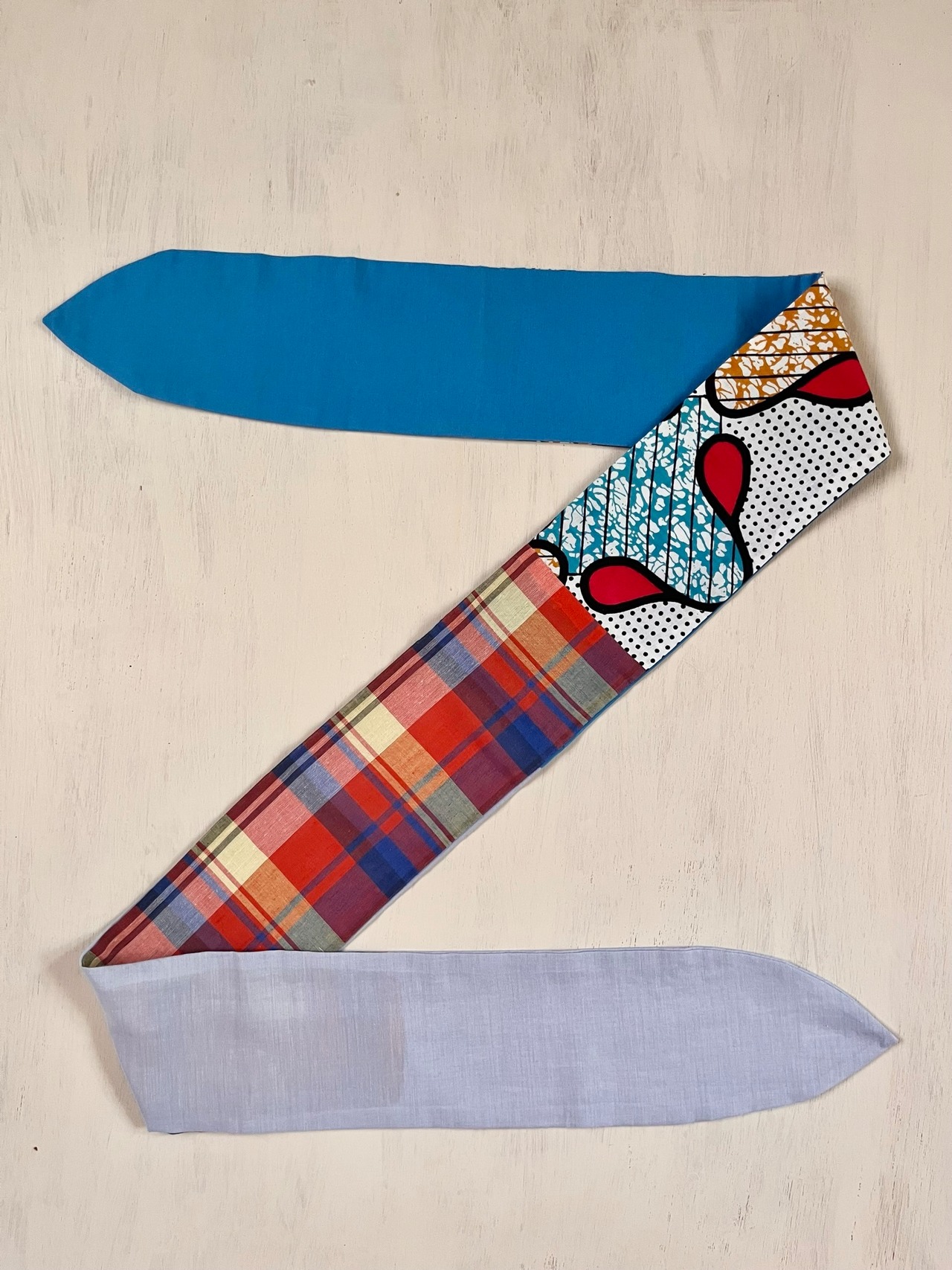 海外で入手した布を中心に、様々な布を組み合わせてつくります。同じ布の組み合わせは全くない、世界にひとつだけの手作りヘアターバンです。